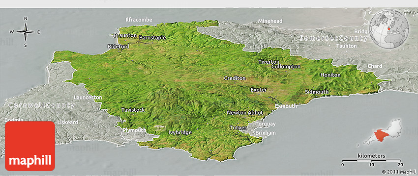 The panoramic satellite map represents one of several map types available. Look at Devon County, South West, England, United Kingdom from different perspectives.