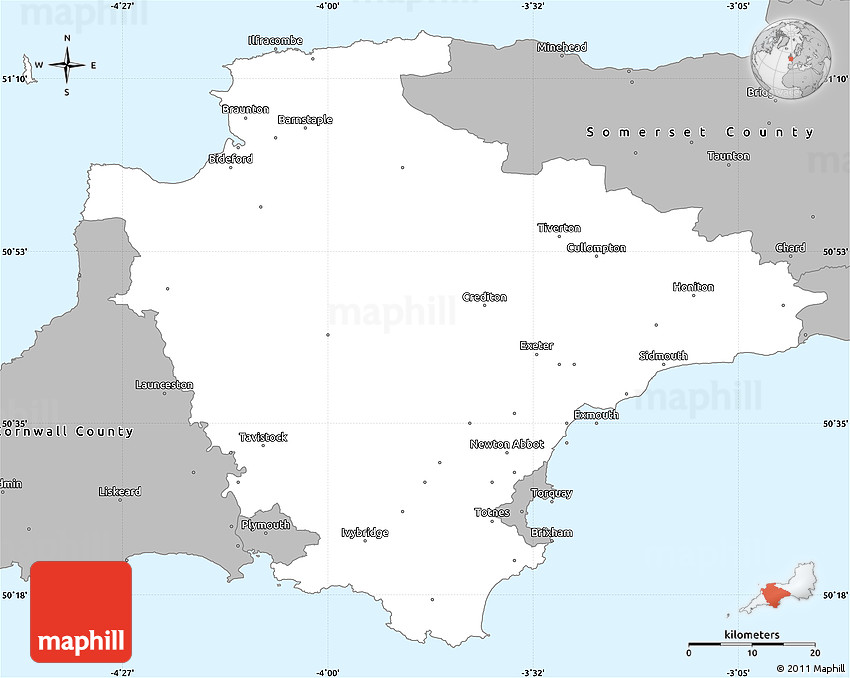 The gray outline map represents one of several map types available. Look at Devon County, South West, England, United Kingdom from different perspectives.
