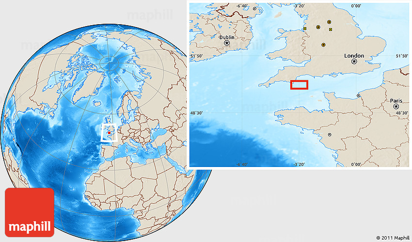 The location map of Slapton combines two projections: the orthographic azimuthal projection for the globe and the simple geographic projection for the rectangular part of the map. Geographic projection has straight meridians and parallels, each degree of latitude and longitude is the same size over the entire world map.