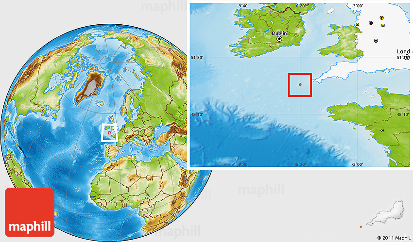 Maphill is a collection of map images. This image combines a physical map with the globe centered on Isles of Scilly. Use the buttons under the image to switch to different map types.