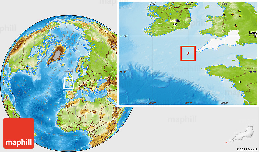 Maphill is a collection of map images. This image combines a physical map with the globe centered on Isles of Scilly. Use the buttons under the image to switch to different map types.