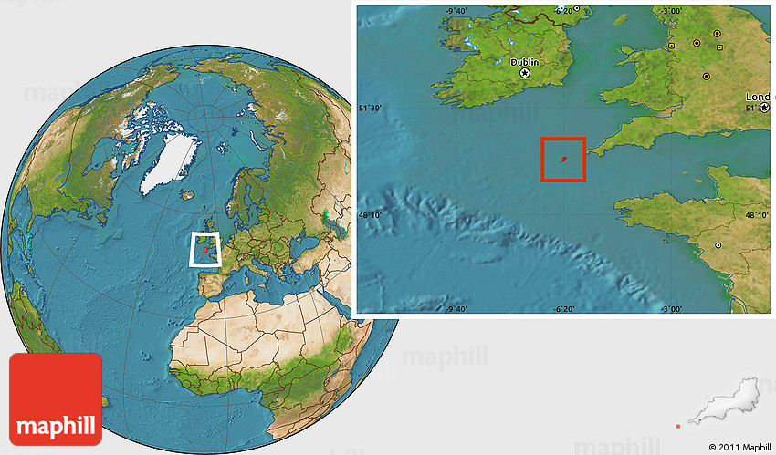 Maphill is a collection of map images. This image combines a satellite map with the globe centered on Isles of Scilly. Use the buttons under the image to switch to different map types.