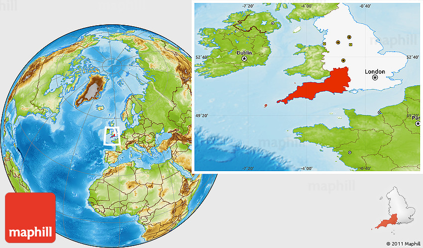 Maphill is a collection of map images. This image combines a physical map with the globe centered on South West. Use the buttons under the image to switch to different map types.