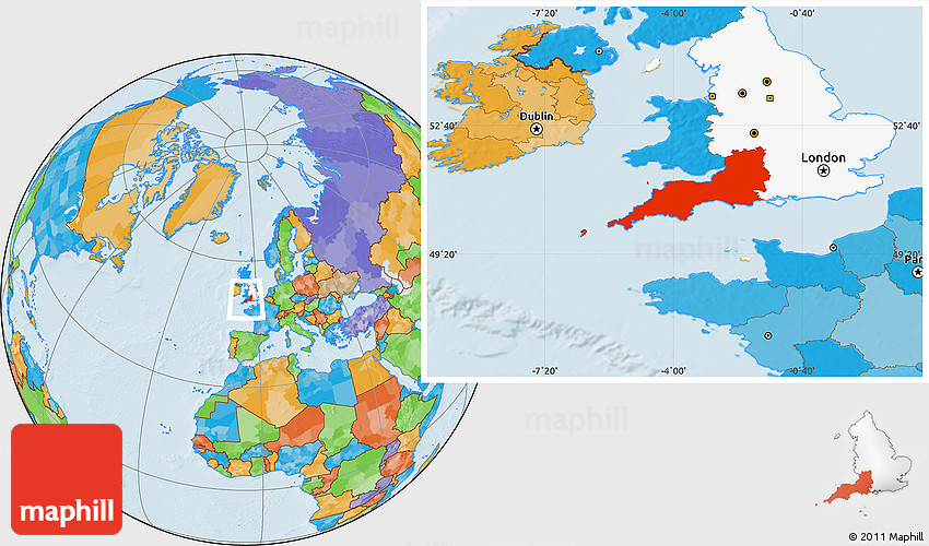 Maphill is a collection of map images. This image combines a political map with the globe centered on South West. Use the buttons under the image to switch to different map types.