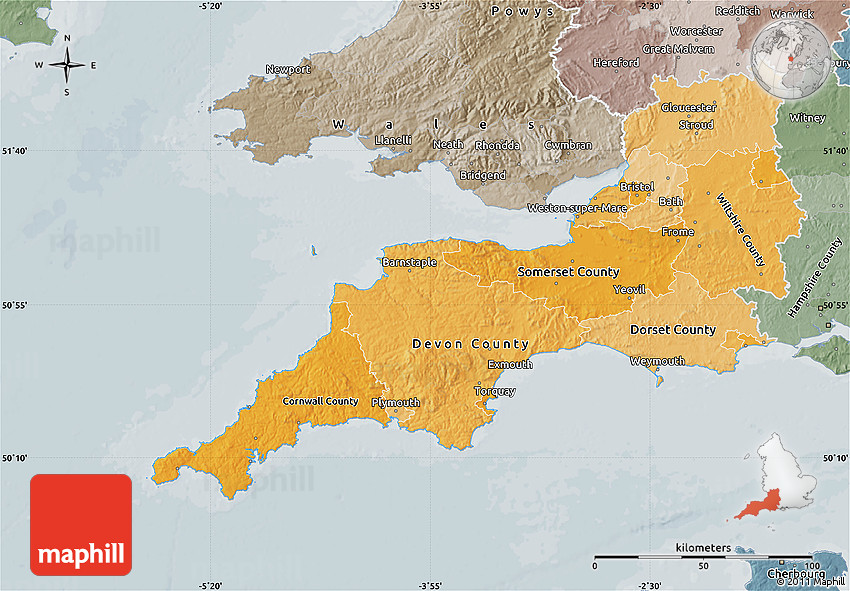 The flat political shades map represents one of several map types and styles available. Look at South West, England, United Kingdom from different perspectives.