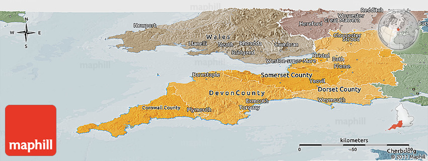 The panoramic political shades map represents one of several map types and styles available. Look at South West, England, United Kingdom from different perspectives.