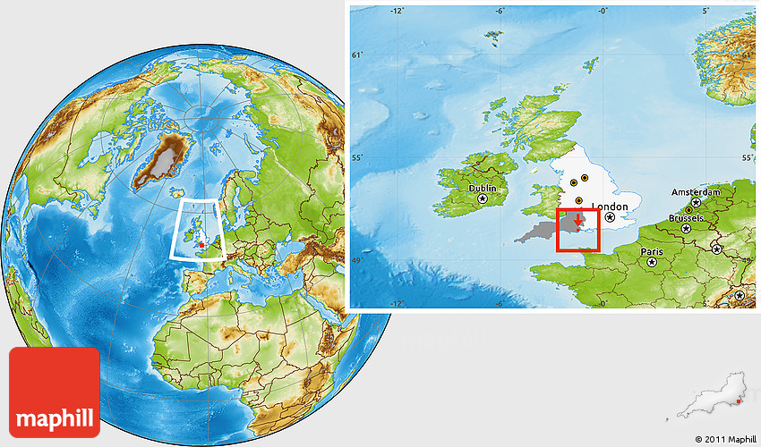 Maphill is a collection of map images. This image combines a physical map with the globe centered on Poole. Use the buttons under the image to switch to different map types.