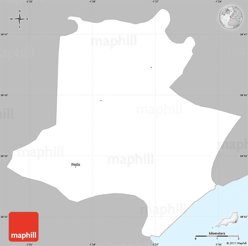 The gray outline map represents one of several map types available. Look at Poole, South West, England, United Kingdom from different perspectives.