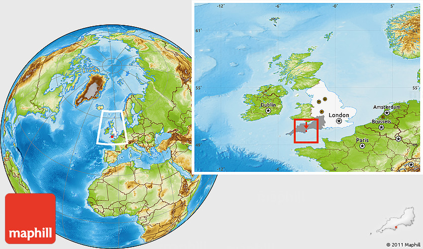 Maphill is a collection of map images. This image combines a physical map with the globe centered on Torbay. Use the buttons under the image to switch to different map types.