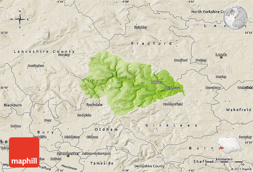 Maphill is a collection of map images. This physical map of Calderdale is one of them. Click on the Detailed button under the image to switch to a more detailed map.