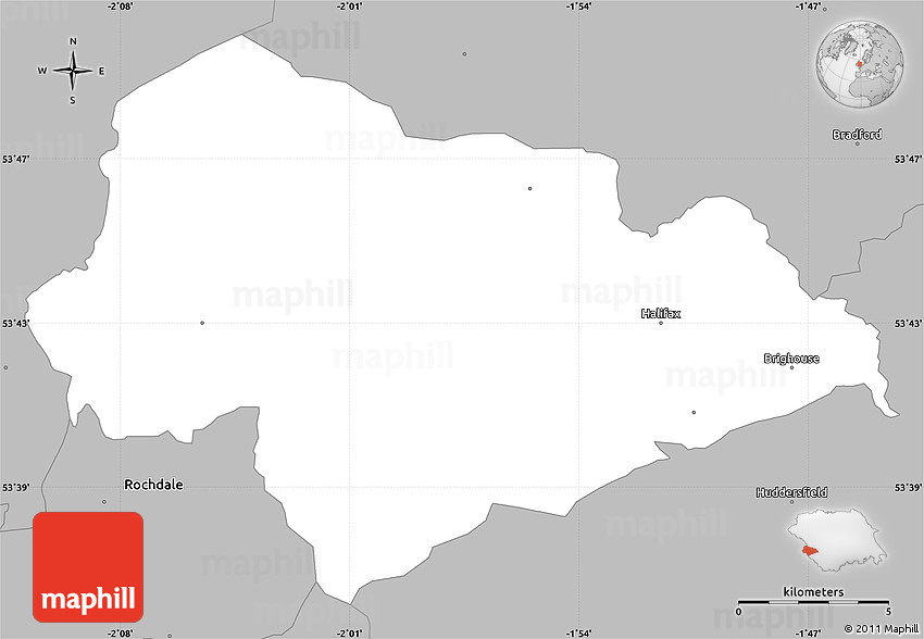 The gray outline map represents one of several map types available. Look at Calderdale, Yorkshire and Humberside, England, United Kingdom from different perspectives.