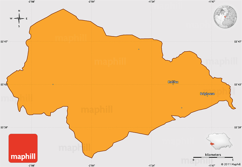 Each map type offers different information and each map style is designed for a different purpose. Read about the styles and map projection used in the above map (Political Simple Map of Calderdale, cropped outside).
