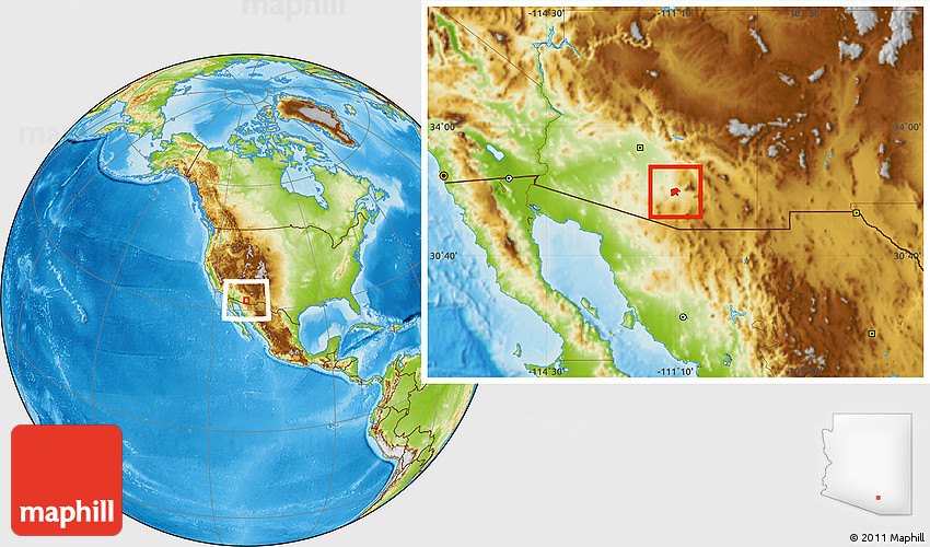 Maphill is a collection of map images. This image combines a physical map with the globe centered on ZIP code 85743. Use the buttons under the image to switch to different map types.