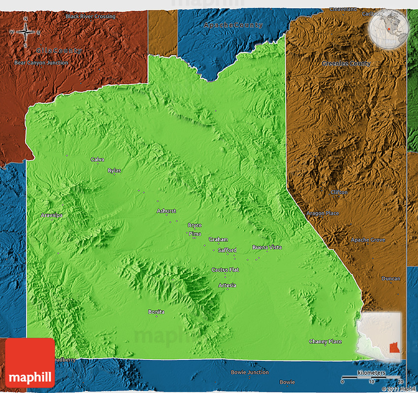 The 3D political map represents one of several map types and styles available. Look at Graham County, Arizona, United States from different perspectives.