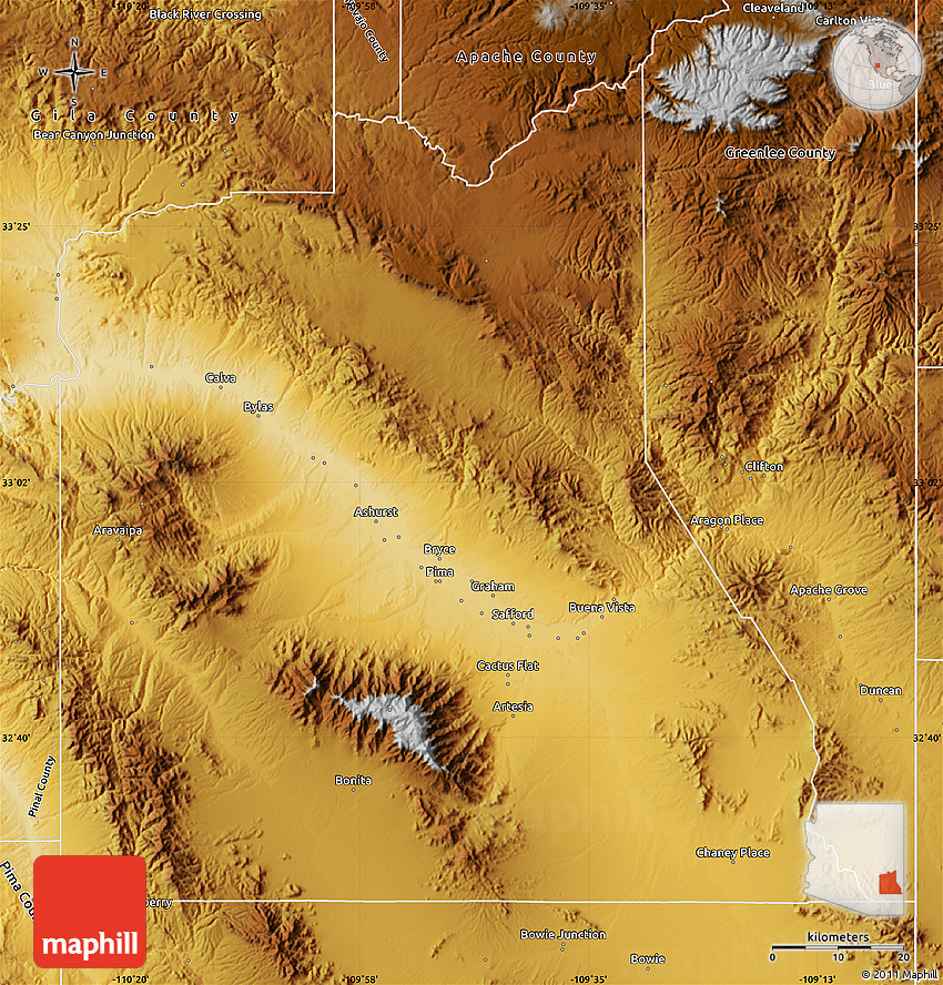 The flat physical map represents one of several map types and styles available. Look at Graham County, Arizona, United States from different perspectives.