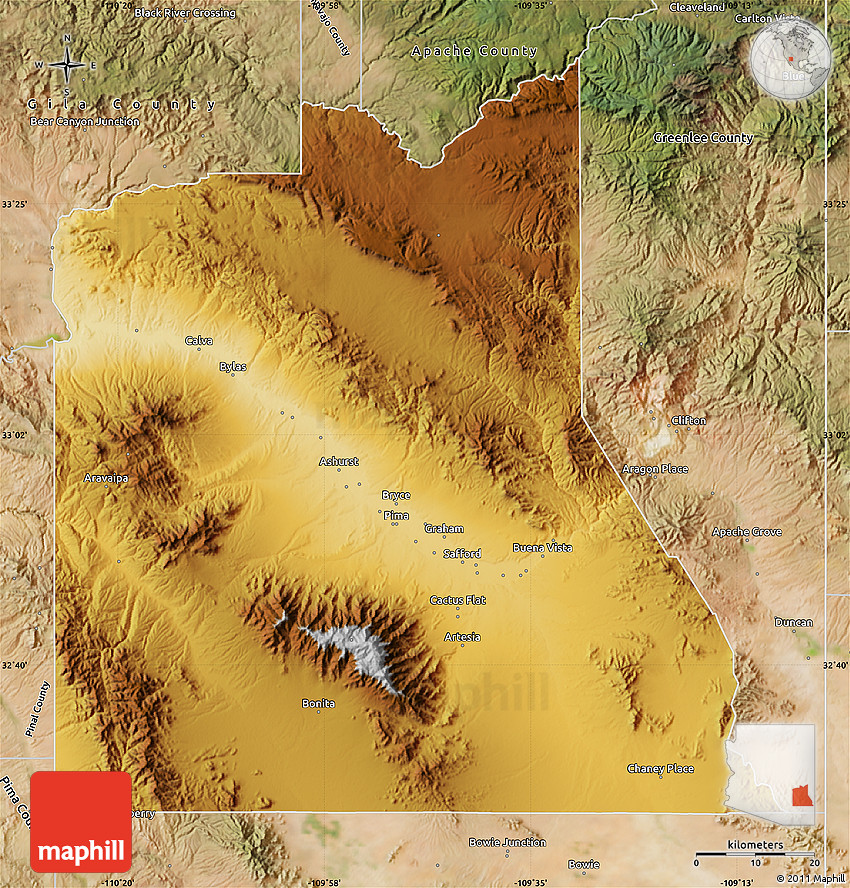 The flat physical map represents one of several map types and styles available. Look at Graham County, Arizona, United States from different perspectives.