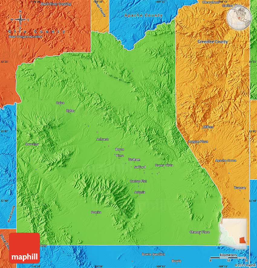 The flat political map represents one of several map types and styles available. Look at Graham County, Arizona, United States from different perspectives.
