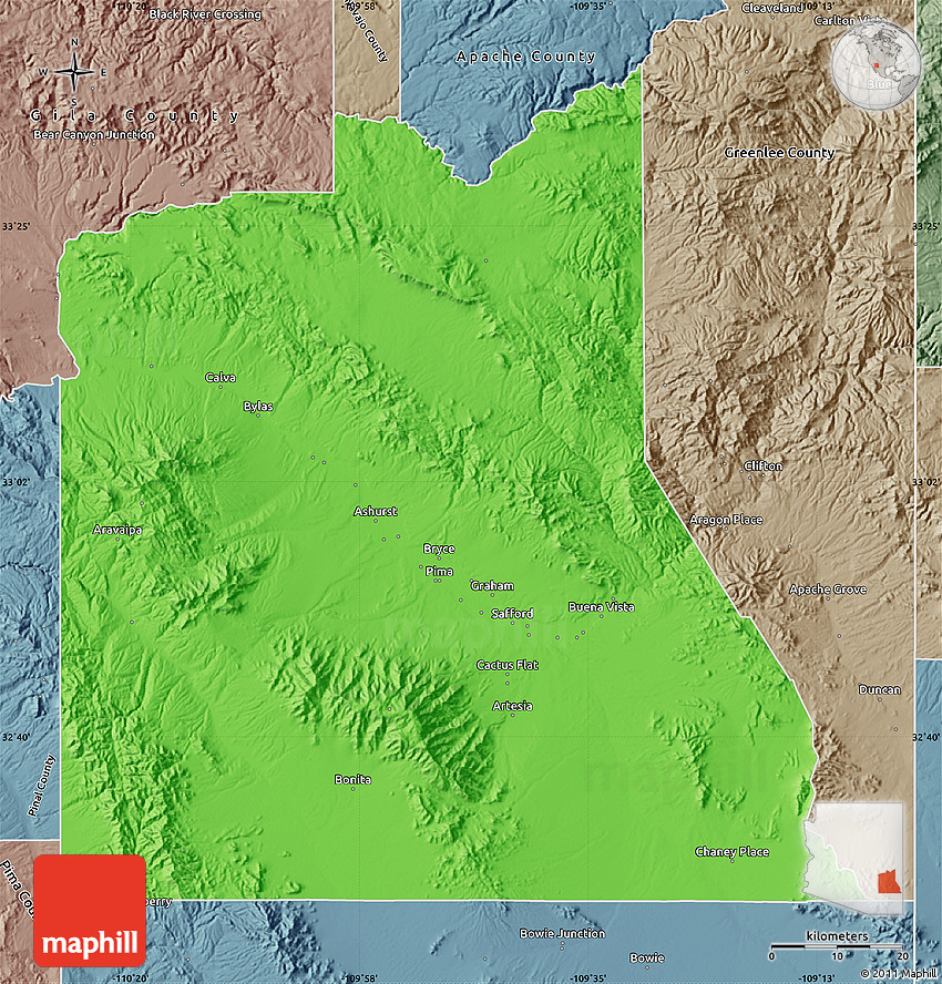 The flat political map represents one of several map types and styles available. Look at Graham County, Arizona, United States from different perspectives.