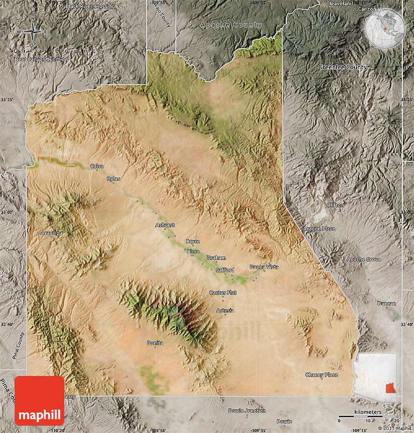The flat satellite map represents one of several map types and styles available. Look at Graham County, Arizona, United States from different perspectives.