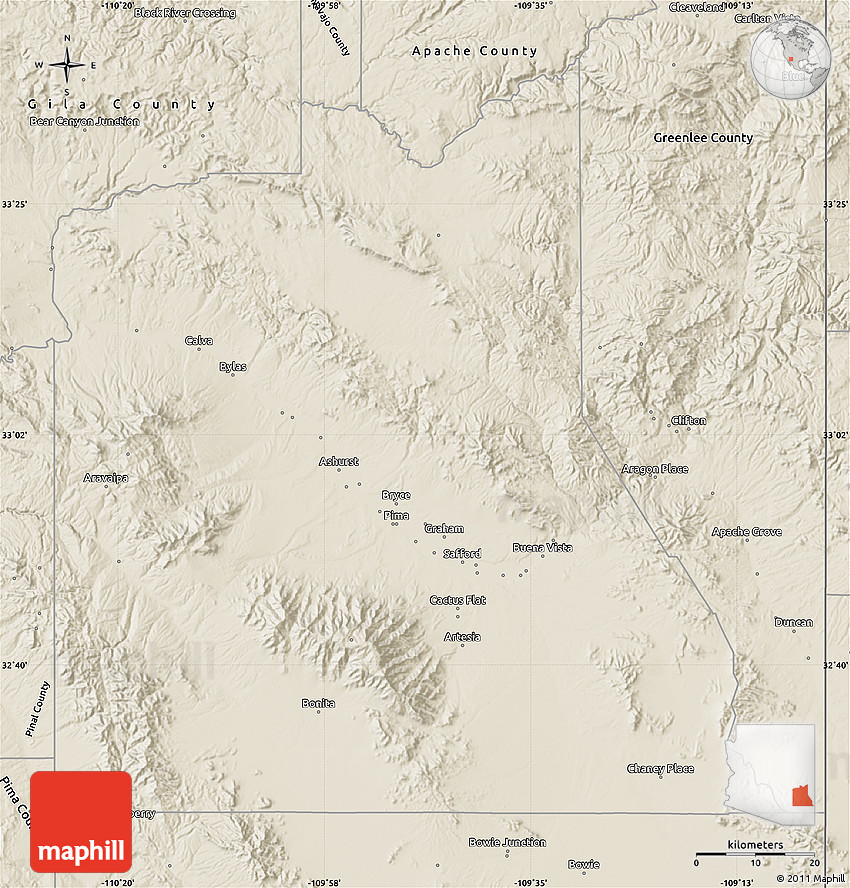 The flat shaded relief map represents one of several map types and styles available. Look at Graham County, Arizona, United States from different perspectives.