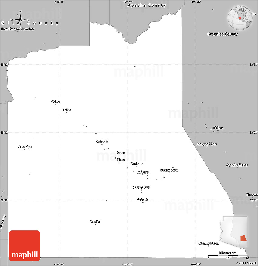 The simple gray outline map represents one of several map types and styles available. Look at Graham County, Arizona, United States from different perspectives.