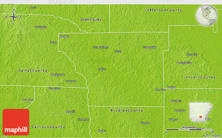 The 3D physical map represents one of several map types and styles available. Look at Cleveland County, Arkansas, United States from different perspectives.