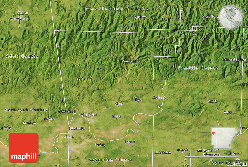 The flat satellite map represents one of several map types and styles available. Look at Crawford County, Arkansas, United States from different perspectives.
