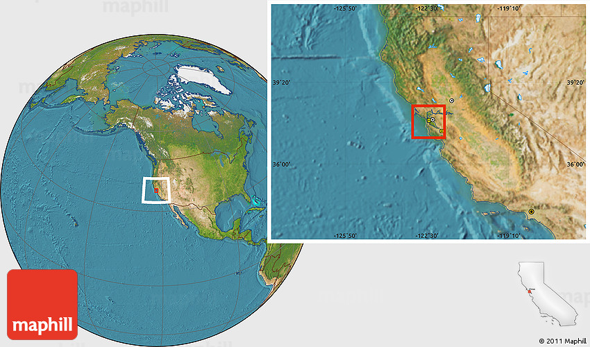 Maphill is a collection of map images. This image combines a satellite map with the globe centered on ZIP codes starting with 941. Use the buttons under the image to switch to different map types.