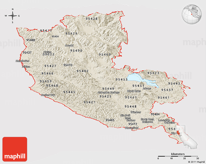 The panoramic shaded relief map represents one of several map types and styles available. Look at ZIP codes starting with 954 from different perspectives.
