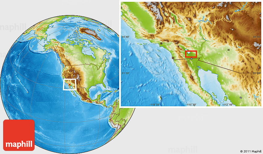 Maphill is a collection of map images. This image combines a physical map with the globe centered on Perrys Corner. Use the buttons under the image to switch to different map types.