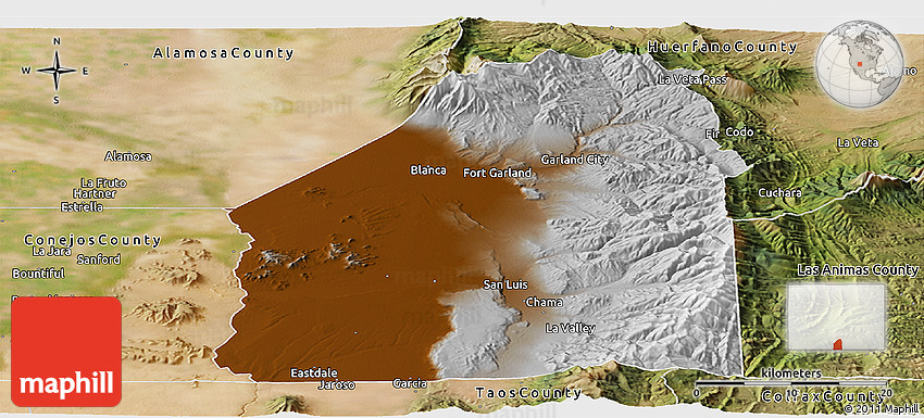 The panoramic physical map represents one of several map types and styles available. Look at Costilla County, Colorado, United States from different perspectives.