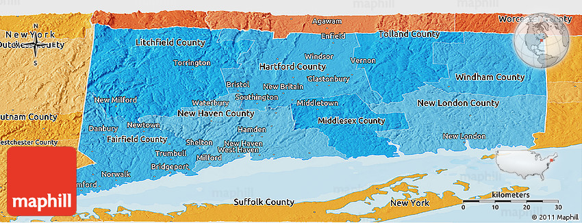 The value of Maphill lies in the possibility to look at the same area from several perspectives. Maphill presents the map of Connecticut in a wide variety of map types and styles.