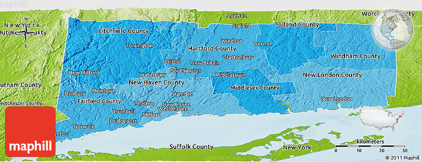 The value of Maphill lies in the possibility to look at the same area from several perspectives. Maphill presents the map of Connecticut in a wide variety of map types and styles.