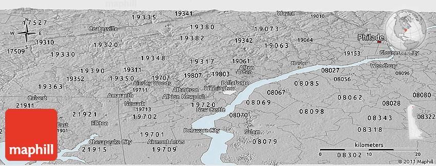 The panoramic gray ZIP code map represents one of several map styles available. Look at ZIP code 19802 from different perspectives.