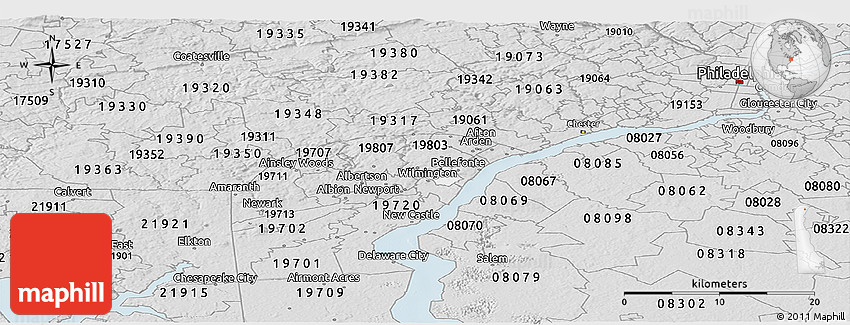 The panoramic silver style ZIP code map represents one of several map styles available. Look at ZIP code 19802 from different perspectives.
