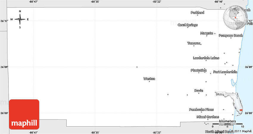 The simple silver style outline map represents one of several map types and styles available. Look at Broward County, Florida, United States from different perspectives.