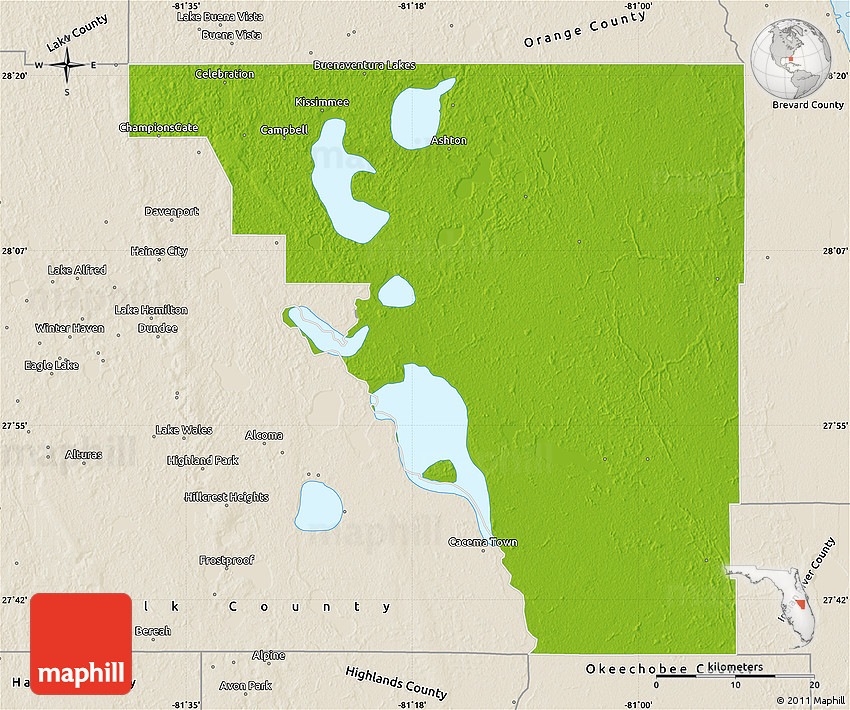 The flat physical map represents one of several map types and styles available. Look at Osceola County, Florida, United States from different perspectives.