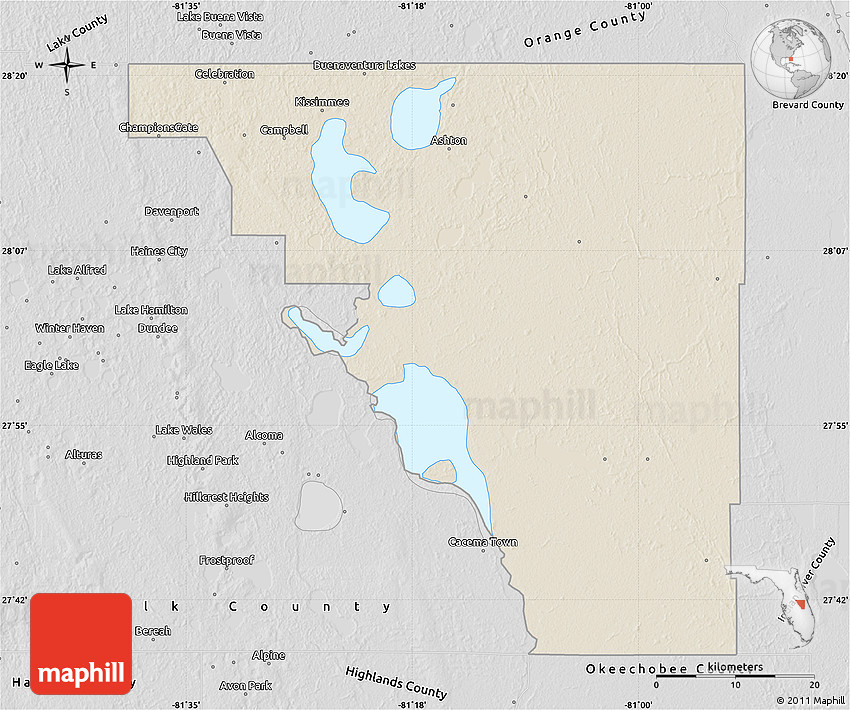 The flat shaded relief map represents one of several map types and styles available. Look at Osceola County, Florida, United States from different perspectives.