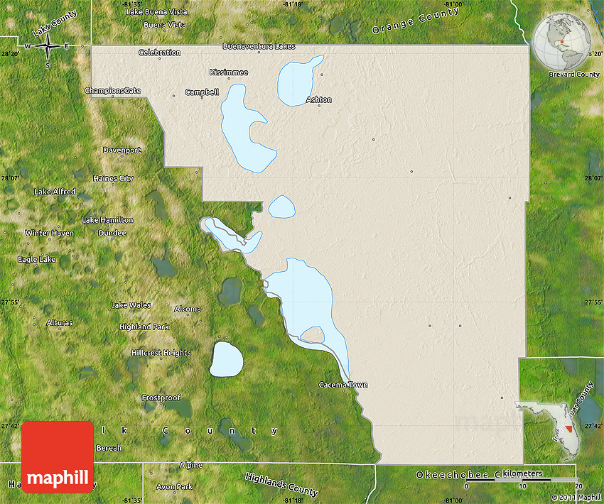 The flat shaded relief map represents one of several map types and styles available. Look at Osceola County, Florida, United States from different perspectives.