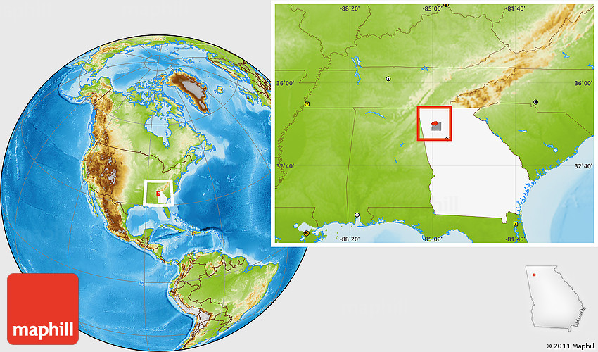 Maphill is a collection of map images. This image combines a physical map with the globe centered on ZIP code 30103. Use the buttons under the image to switch to different map types.