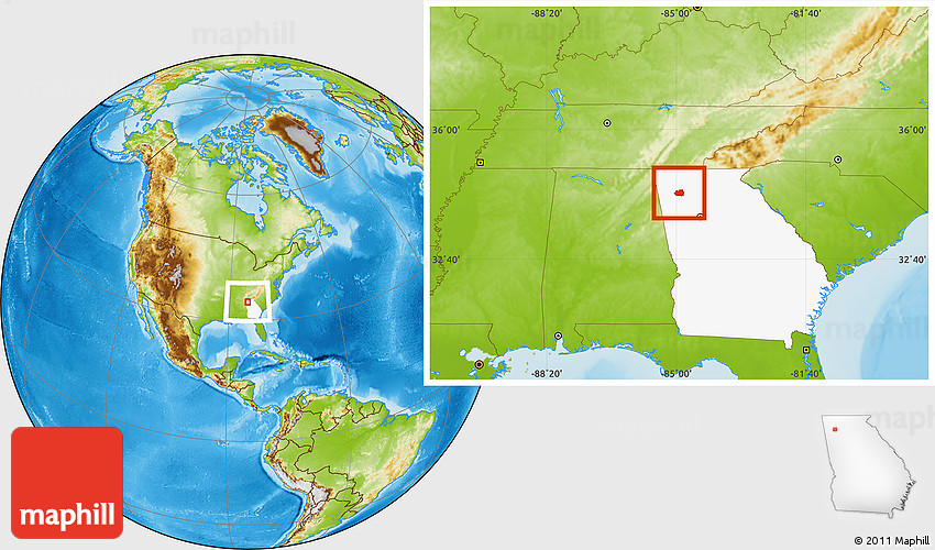 Maphill is a collection of map images. This image combines a physical map with the globe centered on ZIP code 30103. Use the buttons under the image to switch to different map types.