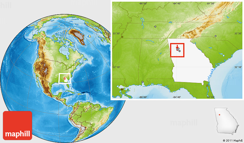 Maphill is a collection of map images. This image combines a physical map with the globe centered on ZIP code 30106. Use the buttons under the image to switch to different map types.
