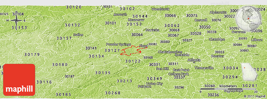 The panoramic physical ZIP code map represents one of several map styles available. Look at ZIP code 30106 from different perspectives.