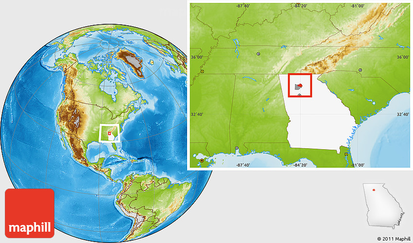 Maphill is a collection of map images. This image combines a physical map with the globe centered on ZIP code 30107. Use the buttons under the image to switch to different map types.