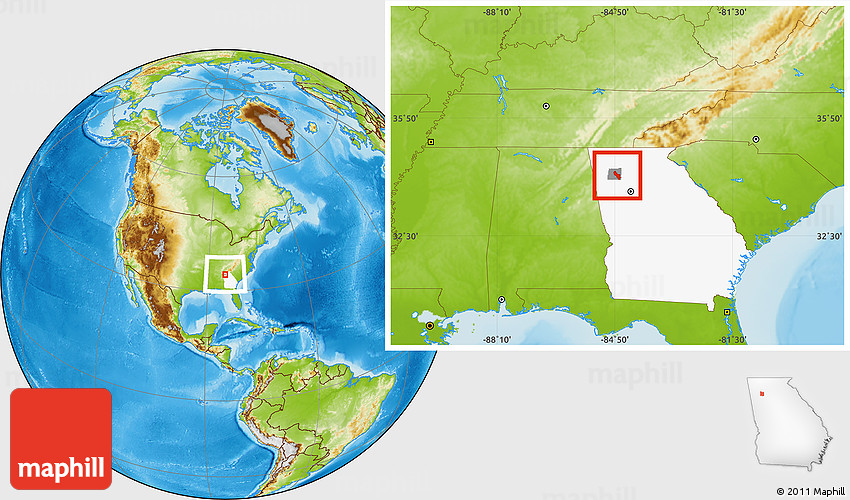 Maphill is a collection of map images. This image combines a physical map with the globe centered on ZIP code 30121. Use the buttons under the image to switch to different map types.
