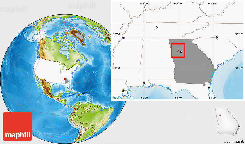 Maphill is a collection of map images. This image combines a physical map with the globe centered on ZIP code 30127. Use the buttons under the image to switch to different map types.