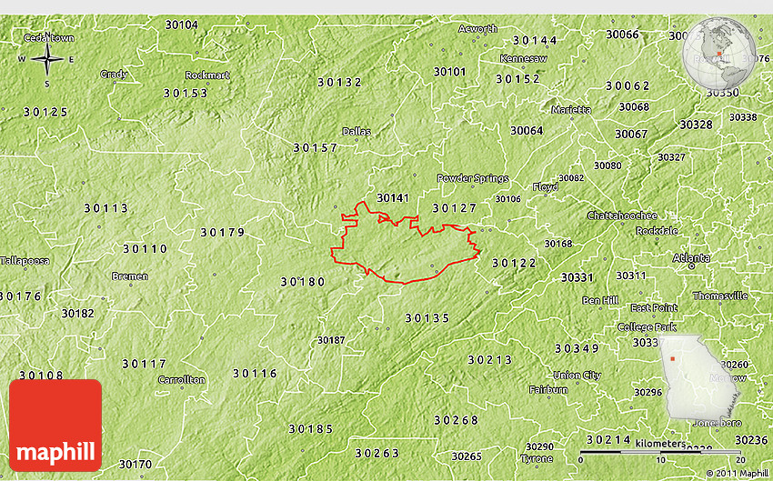 Use the buttons for Facebook, Twitter or Google+ to share a link to this physical map of ZIP code 30134. Maphill is the largest map gallery on the web. However, if the number of maps was the only reason to visit Maphill, then it's really not much.