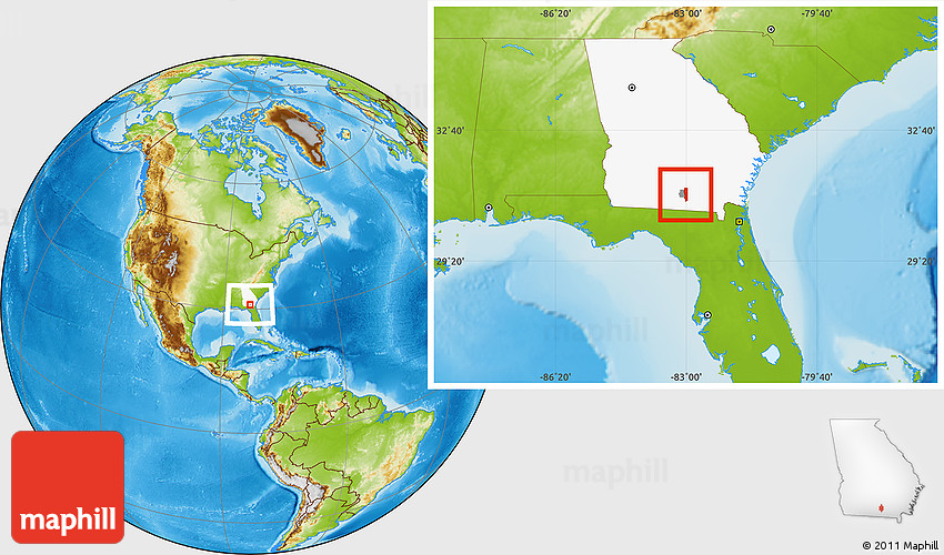 Maphill is a collection of map images. This image combines a physical map with the globe centered on ZIP code 31649. Use the buttons under the image to switch to different map types.