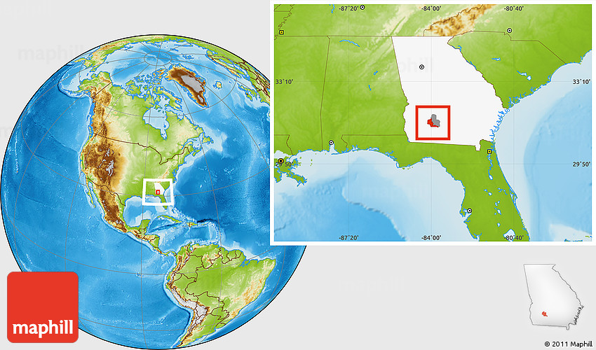 Maphill is a collection of map images. This image combines a physical map with the globe centered on ZIP code 31705. Use the buttons under the image to switch to different map types.
