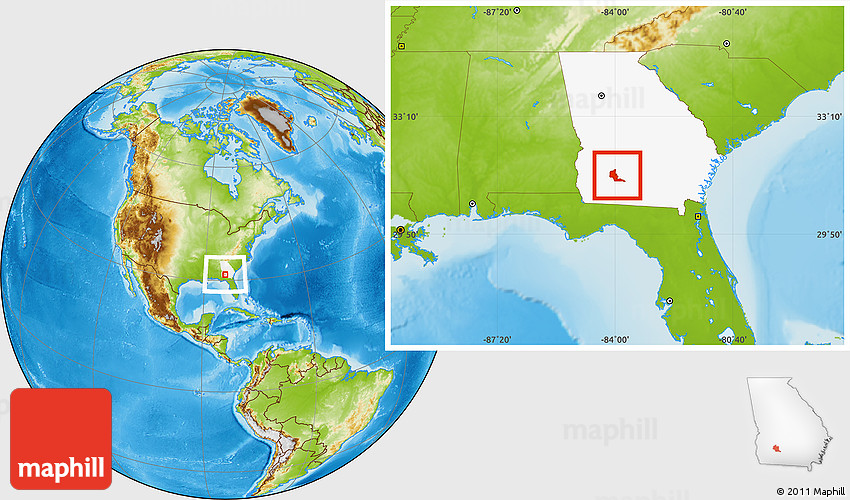 Maphill is a collection of map images. This image combines a physical map with the globe centered on ZIP code 31705. Use the buttons under the image to switch to different map types.